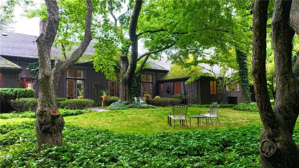 Rare Ranch Set on a private, picturesque, rolling near acre framed by mature trees and garden beds and backing to the phenomenal Pittsford Trail System which meanders through “forever wild” to the Erie Canal, a unique opportunity awaits. Approaching this special home, note the porch running the entire front of the house, creating a warm and welcoming entrance. Step through double doors into the tiled foyer with coat closet, which opens to a spacious living room. Tall windows flood the space with natural light and overlook the beautiful rear yard where deer can often be spotted frolicking and colorful birds dot the landscape. The living room flows seemlessly into the dining room enhanced by crown molding, a large window, and a built-in custom buffet with cabinets and drawers—ideal for entertaining. The open concept plan continues into the sprawling paneled family room, featuring pegged oak floors, a gas fireplace on a brick wall with marble mantel, twin log storage nooks, built-in bookcases, and large storage cabinets. Glass doors open to a tiled, heated/cooled sunroom with walls of windows, a ceiling fan, and access to the capacious rear yard. Imagine the wonderful family and friend gatherings in these two adjacent spaces! A cook’s kitchen awaits with a GE five-burner gas stove, built-in double ovens, abundant cabinetry, tiled backsplash, and a peninsula offering plenty of prep space. The eat-in area, with tall windows overlooking the front yard, includes a glass-front cabinet to display kitchen wares. Adjacent is a tiled powder room, first-floor laundry with utility sink and storage, and a walk-in cedar closet. The bedroom wing boasts a primary suite featuring built-in bookcases and cabinetry, two sets of closets, and an updated bath with granite counters, tiled shower with built-in bench. Two additional bedrooms—perfect for guest, office, or studio—share a tiled family bath with shower and tub. An attached two-car garage with access to both the front porch and rear yard and a full unfinished basement with abundant storage & an activity room awaiting finishing touches complete this home. This remarkable offering is within easy reach of walking trails, schools, shopping, parks, and expressway access. - the perfect home to write your story this Fall.